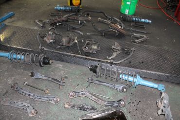 | ダンパー、アーム、リンク、ブレーキ、スタビライザー、念のため、取り外した部位は状態を丁寧に確認。再使用出来る部品もリストに加え、プログラムを進行させる。新品部品が供給されなかった場合に備えてゆくのだ。 |