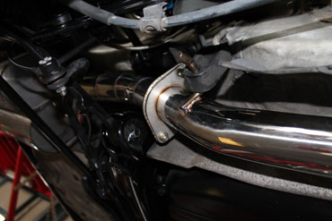 | 「解かるかなァ~」この効率良さそうな『太っとい』の。排気が気持ちよく流速に乗って運ばれてゆくイメージ。市販量産エグゾーストでは、こうは行かないな。その向う側、デリケートな溶接痕はマニアックな「印」だ。レジェンドと言う高性能セダンの「眠れる実力発揮」手段であるのだ。 |
