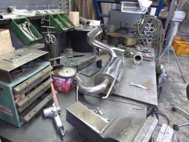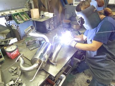 | ミドエンジンである事から、パイプ長さが限られ、難しい製作工程である。慎重に溶接を進めて行く。変速ごとに音質が変わり、ドライバーの気持ちを高揚させ、ドライヴイングへの集中力を高める。そんな事からも、エグゾートシステムは排気装置ではなく、重要な使命を受けた構成品だ。 |